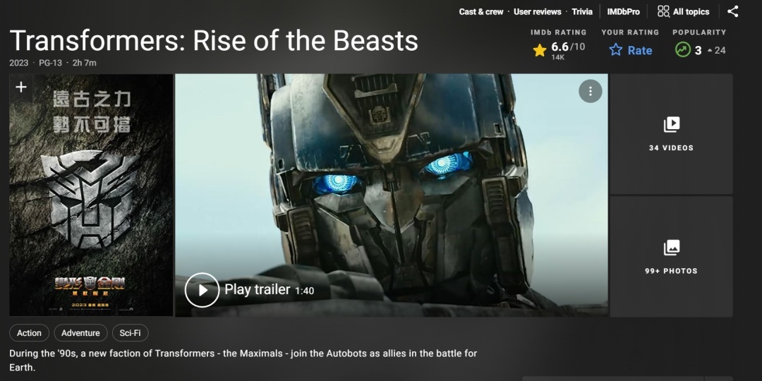 咫尺,海表里对于《变形金刚7》的评价也曾出来了,弗成说最差,但豆瓣6.3分和IMDb 6.6,如实不是一个多高的分数。