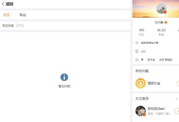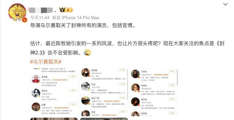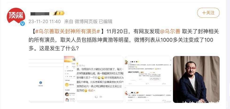 相干词,值得刺眼的是,彼时《封神》系列仅上映了第一部。陈牧驰的黑料曝光引起了不少网友的担忧,相配是挂牵这将对后续《封神》系列的票房产生负面影响。11月20日,一些戒备的网友发现,《封神》的导演乌尔善确切清空了我方的所相干注,这一举动立即引起了热议。有网友纷纷质疑这是否与陈牧驰相干,因为清空所相干注中只取消了一个东谈主,显得过于彰着。